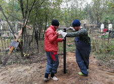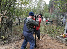 Нам же необходимо было привести территорию могилы в полный порядок. Приступая к работе, мы первым делом вкручиваем определяющие фундамент сваи.