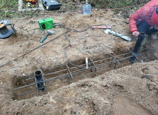 В траншею укладываем арматурную сетку, приварив её к только что вкрученным сваям.