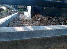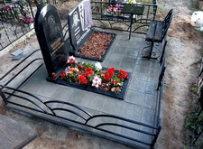 Первым делом мы установили периметр могилы, собранный из бордюрных пролётов. Для этого под оградой была выкопана неглубокая канава, позволяющая надёжно закрепить бетонные плиты в землю. Примыкающие к опорам ограждения блоки были немного подрезаны.